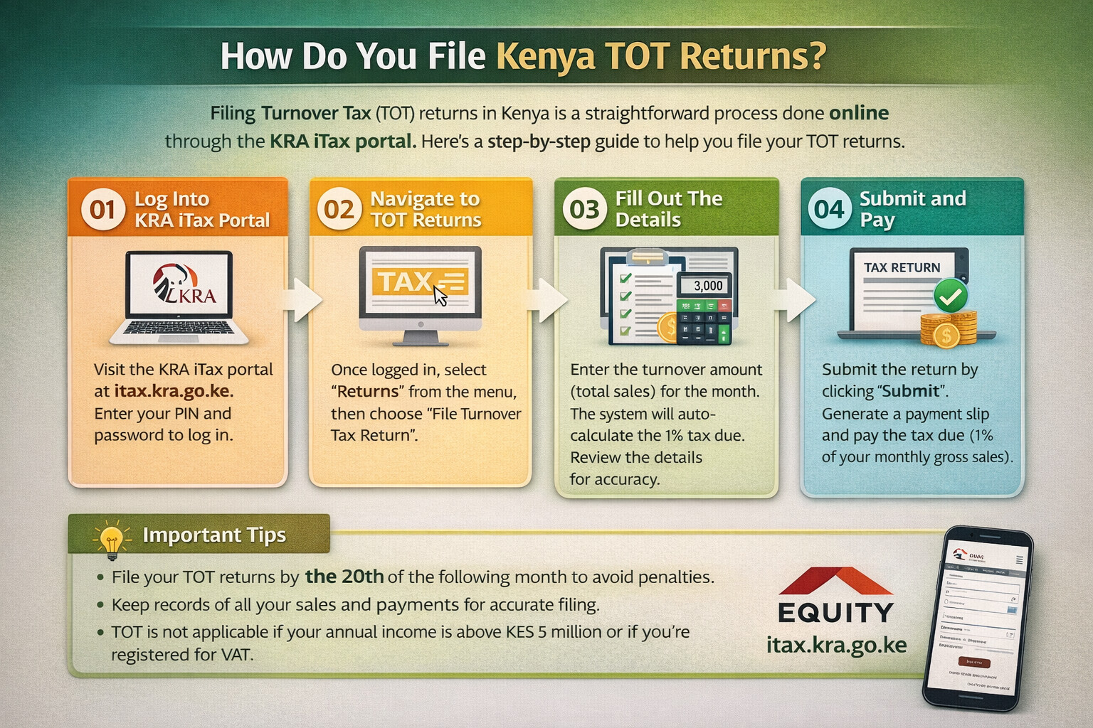 Filing Kenya Turnover Tax (TOT) returns involves a few steps through the Kenya Revenue Authority’s (KRA) online platform, iTax. Here’s a step-by-step guide: