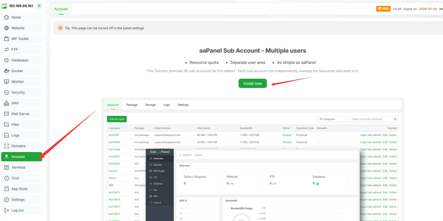 API secret keyfor later use - Install Sub aaPanel in the Account