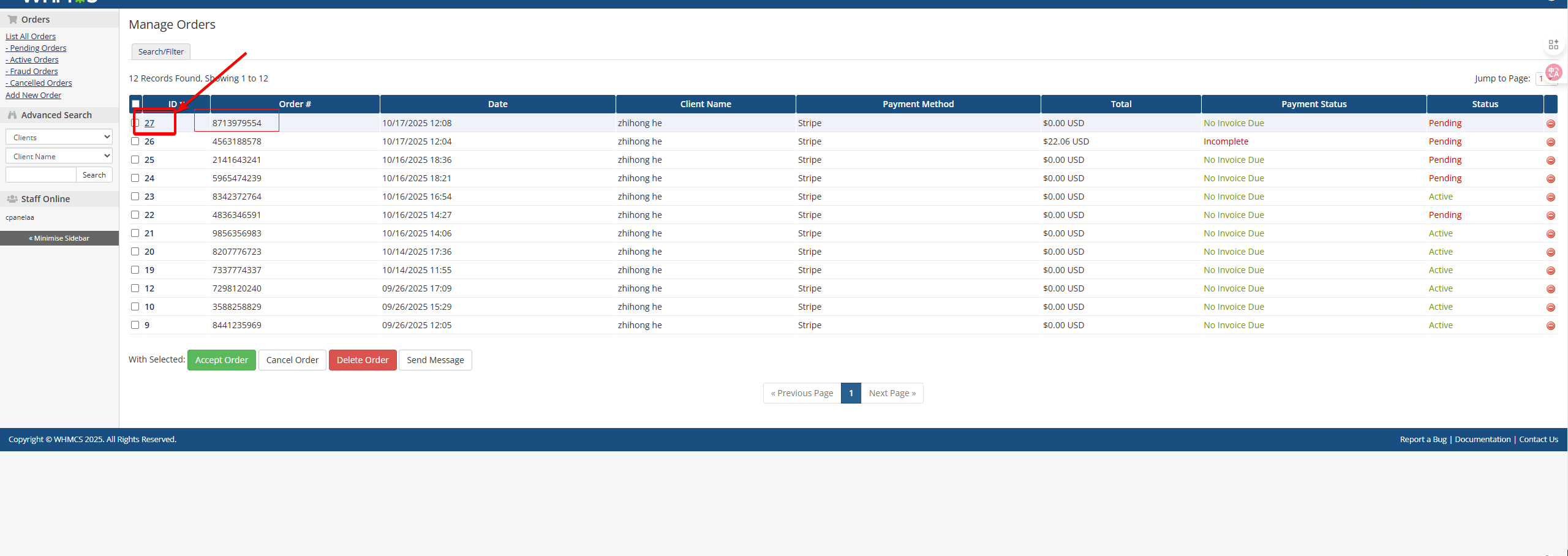- Click the ID to enter the order details page